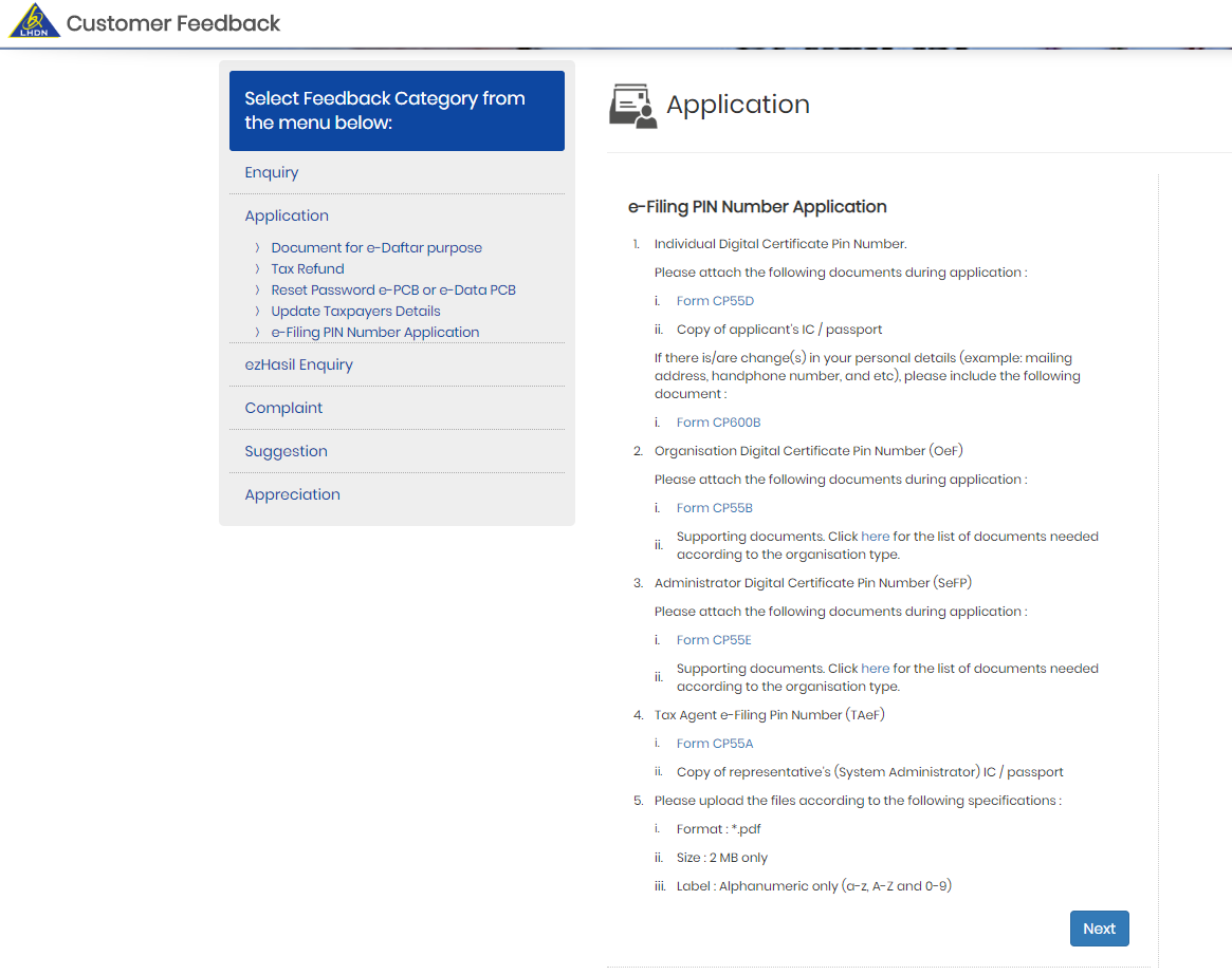 요구하는 서류를 작성하고, 파일을 첨부해서 Feedback Form을 보내면 보통 1주일 내에 답변이 온다. 나의 경우 첨부파일을 정상적으로 보냈음에도 불구하고, LHDN 쪽에서 첨부 서류가 없다며 한번 반려했고, 똑같은 파일을 다시 보냈더니 결국 PIN 넘버를 발급해줬다. 남들은 일주일만에 받는 걸 나는 2주나 걸려서 받았다. 이런 얼렁뚱땅 행정처리가 많으니 시간적 여유를 충분히 두고 신청하세요.